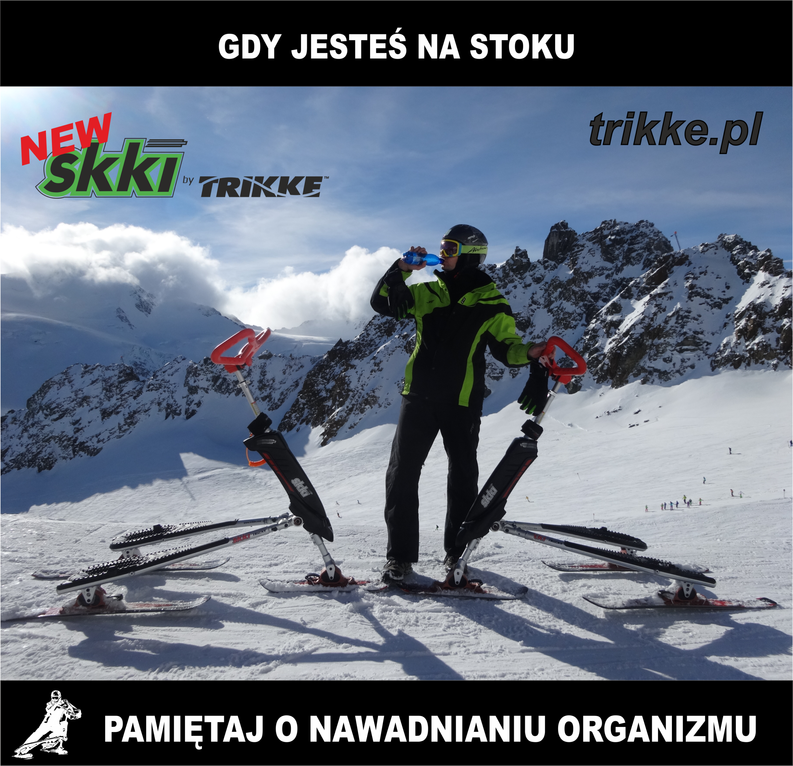Pamiętajcie by będąc na stoku zawsze często nawadniać swój organizm. Nie czujecie tego, ale podczas jazdy na Skki Trikke pod warstwą zimowego ubioru organizm podczas wysiłku intensywnie się poci. Należy uzupełniać płyny, najlepiej niech to będzie zwykła, niegazowana woda. Pół godziny przed wyjazdem na stok zalecamy wypicie szklanki, dwóch wody i po pierwszych dwóch godzinach kolejną. Nie zalecamy podczas uprawiania sportu picia alkoholu pod żadną postacią. Nawet jedno piwo na stoku może mieć przykre konsekwencje. Natomiast po jeździe po powrocie wskazane jest dobre piwo, które idealnie nawodni organizm, wpłynie na mniejsze odczuwanie zakwasów i umili towarzyski wieczór. Podczas jazdy na stoku absolutnie to odradzamy!
