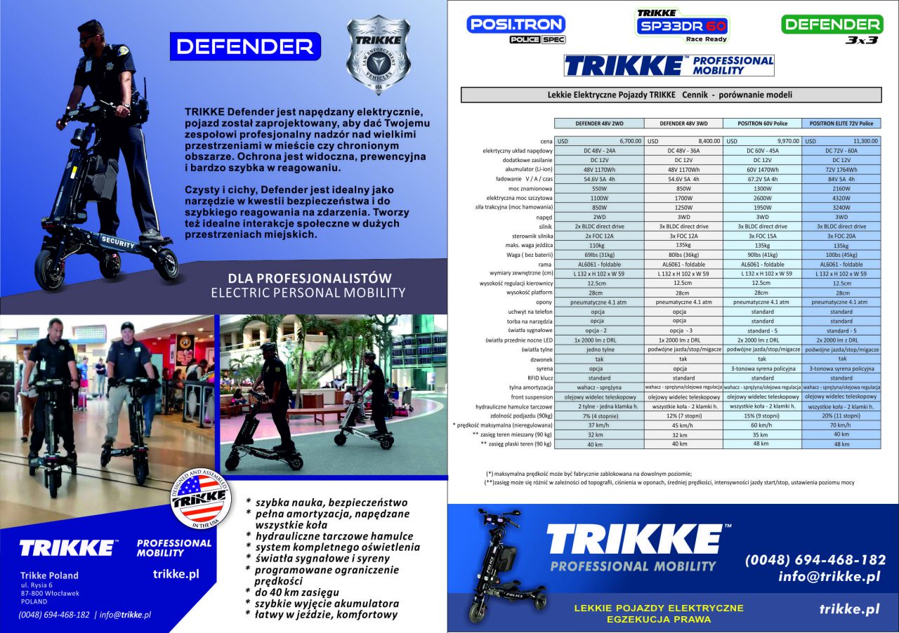 Trikke Poland zapewnia najlepsze na świecie pojazdy mobilności osobistej, które przewodzą transformacji transportu elektrycznego. Te wielozadaniowe, wysoce konfigurowalne pojazdy są produkowane i montowane w USA. Ze specjalnymi właściwościami idealnymi do dojazdów, aktywności fitness, turystyki, bezpieczeństwa, operacji korporacyjnych i wielu innych. Rozległa i rosnąca lista klientów Trikke obejmuje wydziały policji, uczelnie wyższe i uniwersytety, rządy federalne i stanowe, hotele, centra handlowe, lotniska, porty i prywatne firmy z branży obronnej. Każdy z nich używa Trikke, zapewniający najwyższą niezawodność, moc i pozytywny wpływ na środowisko. Aby uzyskać więcej informacji, skontaktuj się z Trikke Poland pod numerem 0048 694 468 182 lub napisz do nas na info@trikke.pl . Aby dowiedzieć się więcej, odwiedź naszą stronę internetową www.trikke.pl